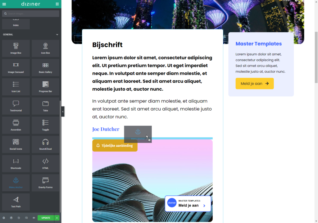 2. Drag en drop de ‘Menu anchor’ widget in de template. Je voegt de widget toe boven de plek waar je naartoe wilt linken;