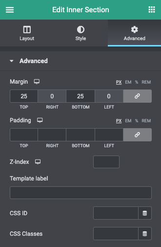 2. Ga in het Diziner panel naar ‘Advanced’ om een z-index te kunnen instellen;