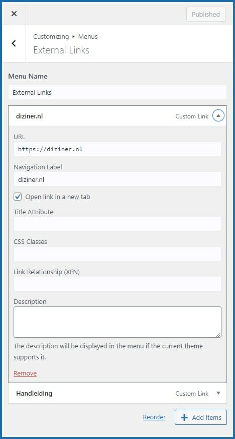 5. Wanneer je een extra link wil toevoegen, klik je op de button Add items;