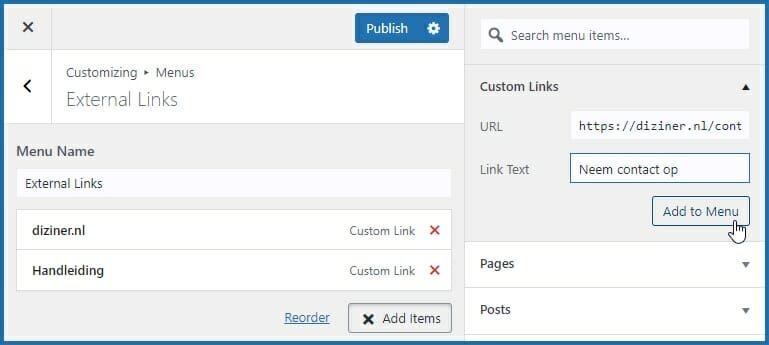 6. Voeg bij URL de link toe en bij Link Text de tekst die aan de voorkant zichtbaar zal zijn. Klik daarna op Add to menu;