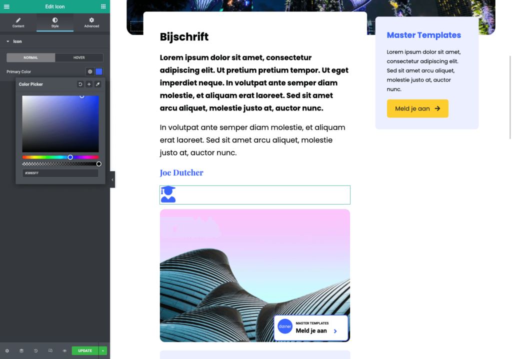 5. Je kunt via de ‘Style’ tab de kleur van het icoon aanpassen. Het is ook mogelijk om de hoverinstellingen van het icoon in te stellen. Hierbij zal het icoon een andere kleur krijgen, wanneer iemand met de muis over het icoon beweegt.