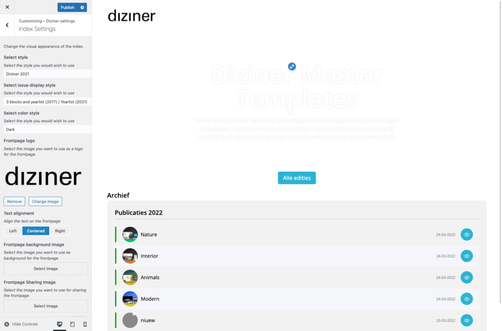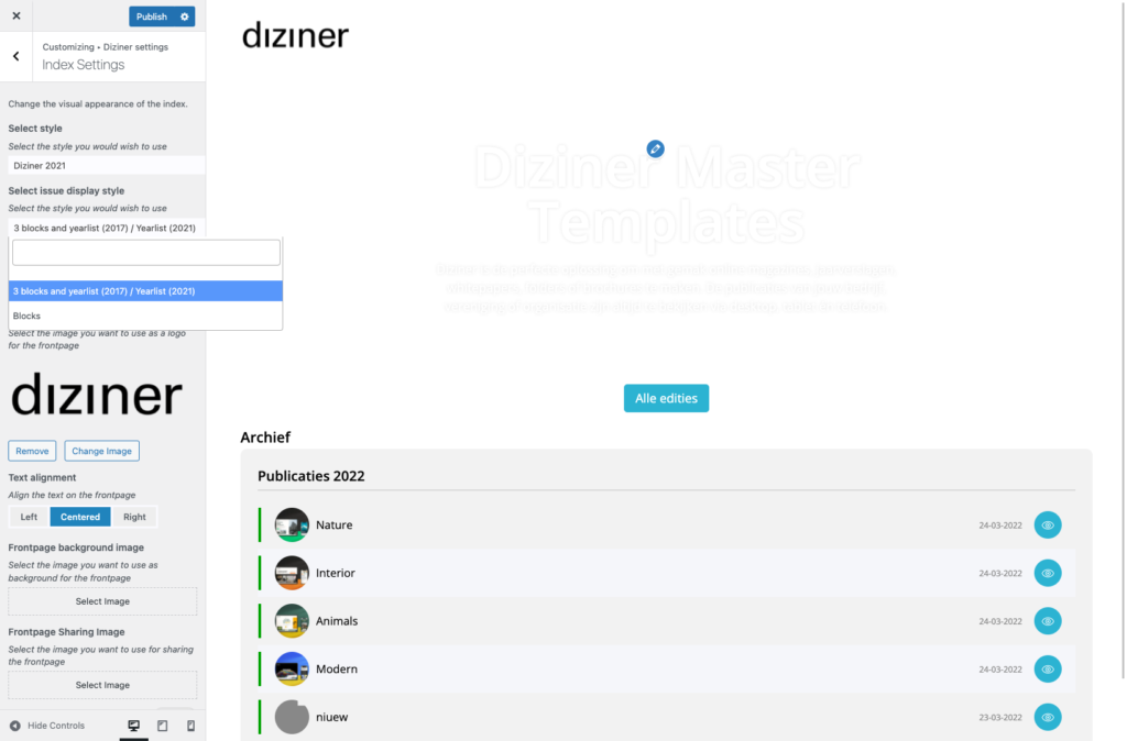 6. Onder ‘Select issue display style’ kies je of je de publicaties in een lijstweergave (3 blocks and yearlist (2017)) wil tonen of alleen maar blokken (blocks).