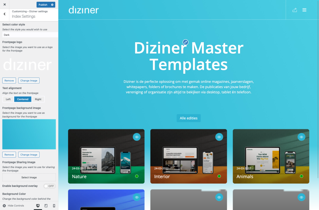 10. Stel onder ‘Frontpage background image’ een achtergrondfoto;