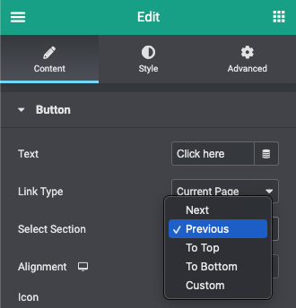3. Wanneer je ‘Previous’ selecteert bij ‘Select Section’ navigeert de link automatisch naar de eerste sectie boven de link;