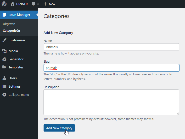 2. Vul onder Name de naam van de nieuwe categorie in en vul onder Slug de slug in. Het veld Description kan leeg gelaten worden. Klik op Add New Category om de nieuwe categorie aan te maken;