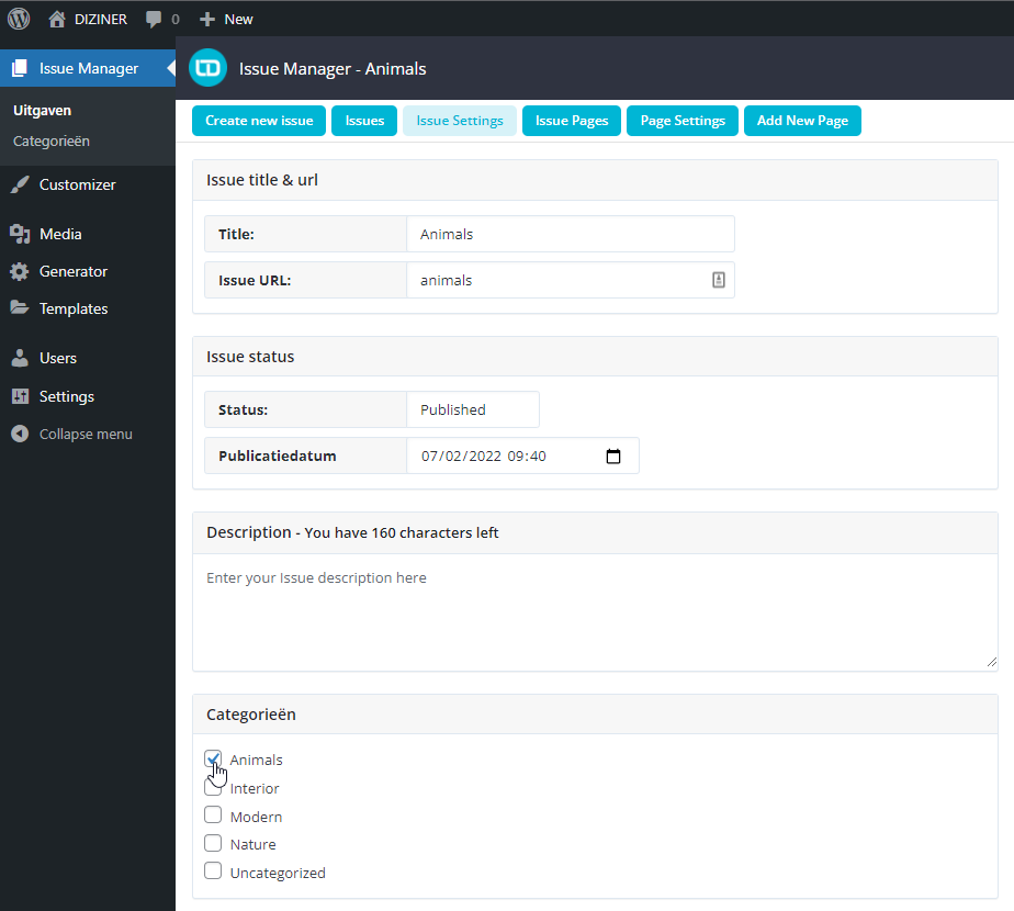 4. Om een publicatie aan een categorie te koppelen op je de Issue settings van een publicatie;