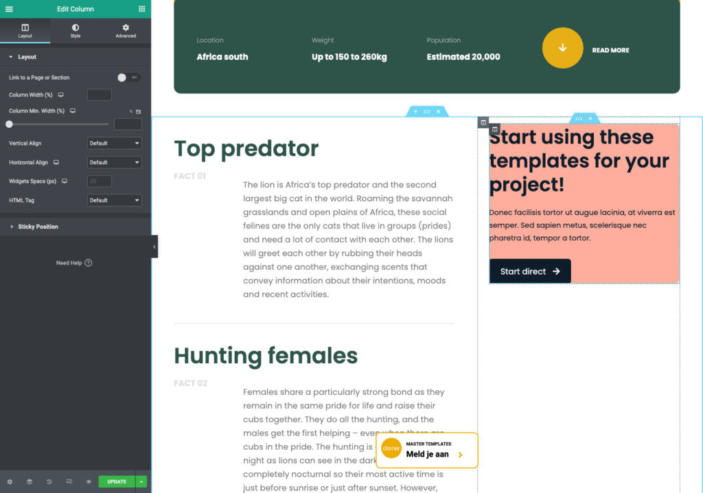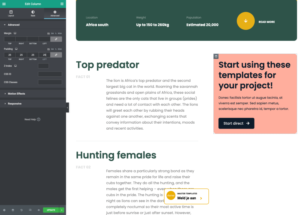 Soms wil je binnen een element ruimte toevoegen, om te voorkomen dat de content tegen de randen aan loopt. In het onderstaande voorbeeld, loopt de tekst bijvoorbeeld tegen de rand van de gekleurde achtergrond aan. Het zou mooier zijn wanneer er wat ruimte om de tekst wordt gezet. Dit is mogelijk door padding op de kolom in te stellen.