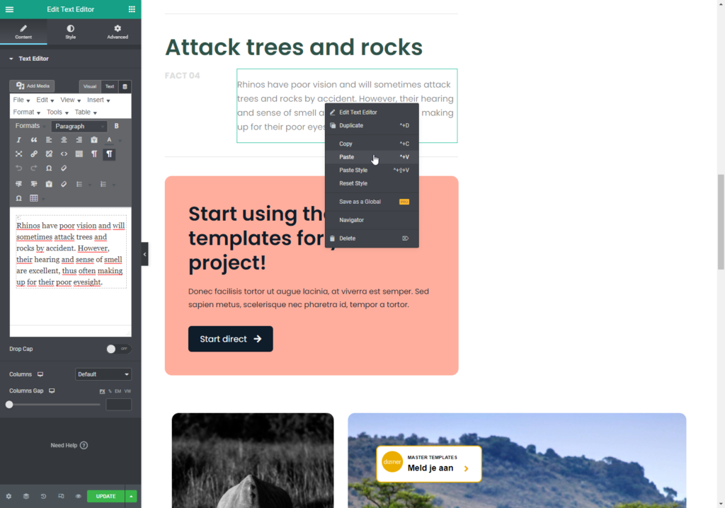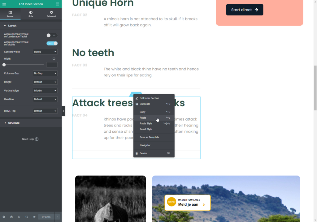 2. Ga naar de sectie waarbij je het zojuist gekopieerde element wil plakken. Klik ook hierbij weer met je rechtermuisknop op het blauwe gridicoontje dat verschijnt wanneer je met je muis over het element verschijnt. Klik deze keer op Paste;