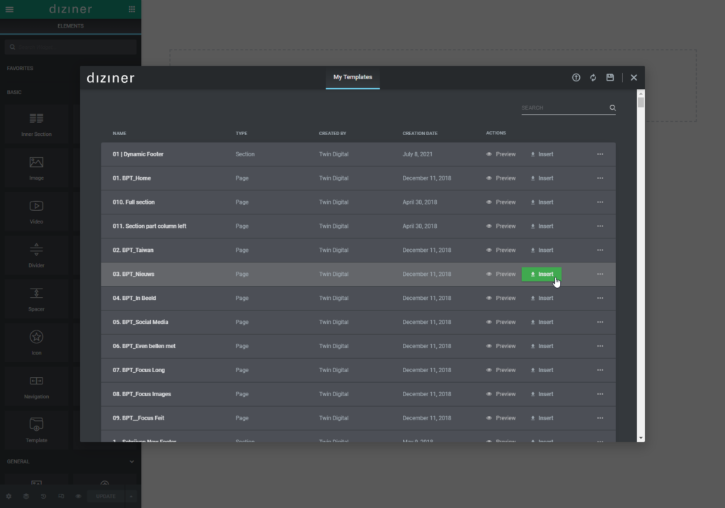 2. Kies het template dat je op de pagina wil plaatsen. Je kunt op ‘Preview’ klikken om het template te laten openen in een nieuw tabblad. Daarmee kun je bekijken of je het juiste template hebt geselecteerd. Om het template in te laden klik je op de groene button ‘Insert’.